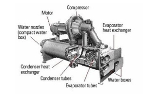 離心式水冷機組,其核心是離心式壓縮機,離心式壓縮機是最早的離心式葉片泵改進的,通過葉片的高速運轉來將制冷劑氣體提速,并通過擴壓器將氣體的速度轉變為氣體的壓力,達到壓縮的目的。